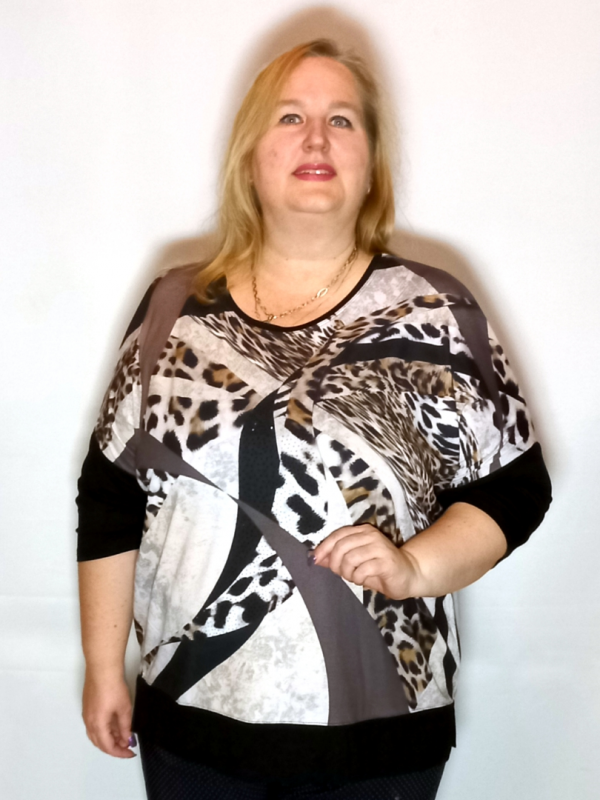 Рукав 3/4, спущенное плечо, нижняя часть из однотонного трикотажа.