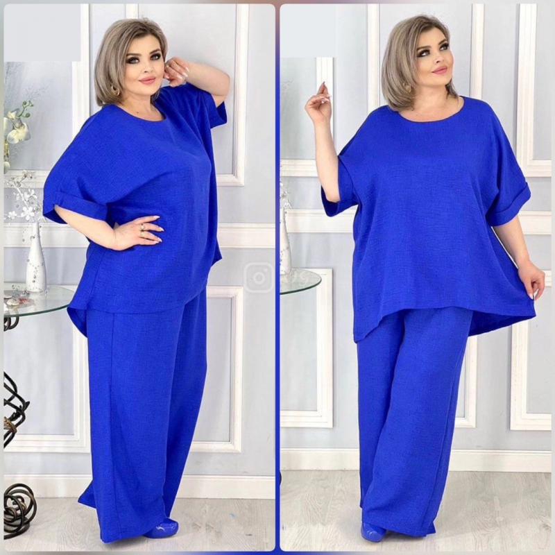 Элегантный, свободный, летний костюм выполнен из ткани сингапур. Ткань легкая, тонкая, но не рыхлая, с эффектом жатости, умеренно эластичная ( в составе есть небольшое содержание хлопка).