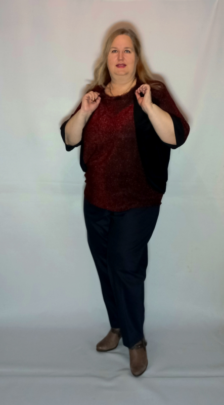Нарядный блузон выполнен из сочетания двух видов трикотажа: черного однотонного и  трикотажа с люрексом. Трикотаж не осыпается (  нить). Трикотаж средней плотности, эластичный, приятный  к телу.