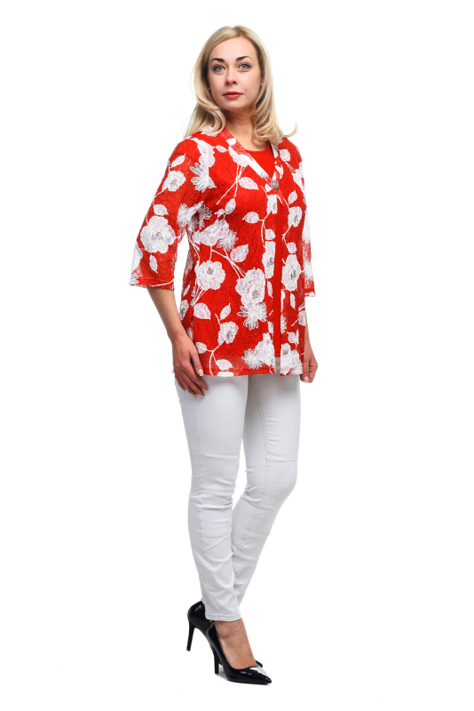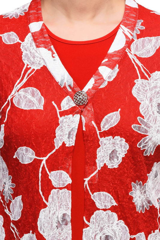 Эффектный стильный кардиган из кружевного полотна с крупным цветочным принтом в комплекте с топом. Модель с втачными широкими рукавами длиной 3/4; конусного силуэта, с V-образным вырезом, застегивается сверху на большую декоративную пуговицу.
