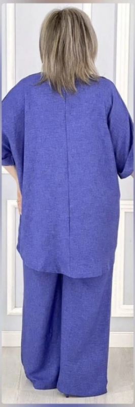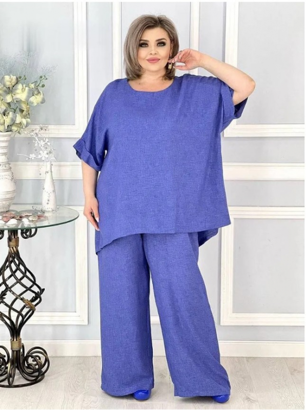 Элегантный, свободный, летний костюм выполнен из ткани сингапур.  Ткань  легкая, тонкая, но не рыхлая, с эффектом жатости, умеренно эластичная ( в составе есть небольшое содержание хлопка).