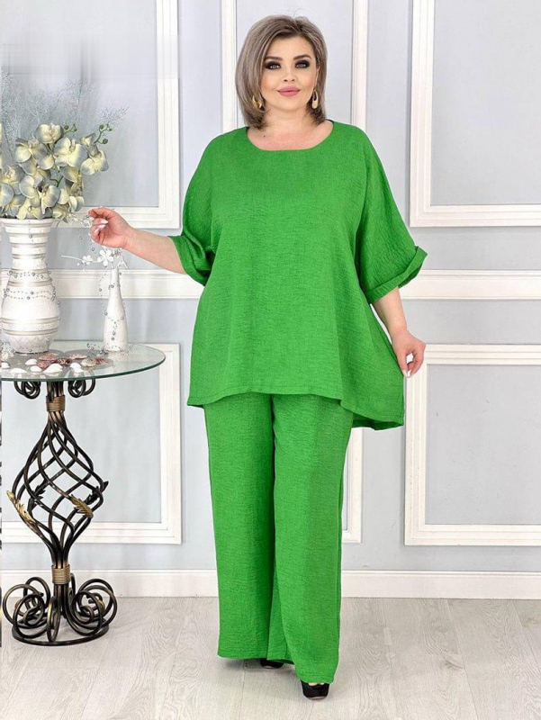 Элегантный, свободный, летний костюм выполнен из ткани сингапур.  Ткань  легкая, тонкая, но не рыхлая, с эффектом жатости, умеренно эластичная ( в составе есть небольшое содержание хлопка).