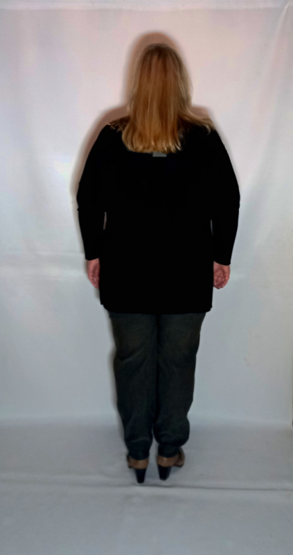 Полочка сложнокроенная: боковые вставки черного цвета, декорированы черными термостразами. Средняя часть полочки из трикотажа "альпака"
