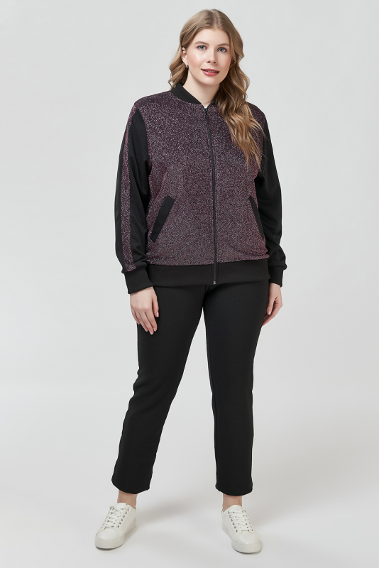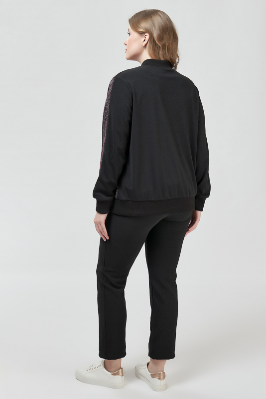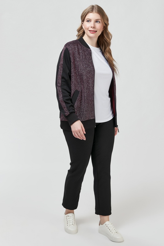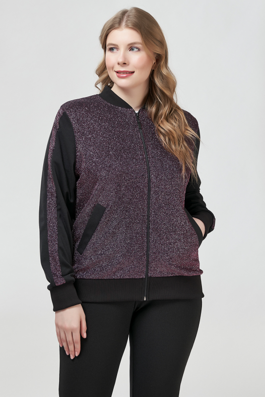 Модная ветровка бомбер, выполненная в стиле «спортивный шик», в комбинации блестящего и матового трикотажа, с длинными втачными рукавами на манжетах и с блестящими лампасами, застежке-молнии, воротником-полустойкой, косыми прорезными карманами с листочкой.