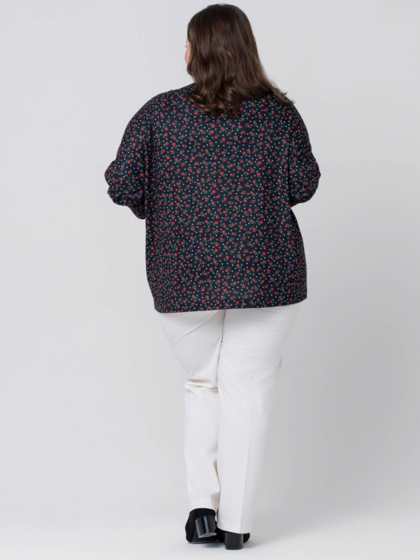Стильный жакет-кардиган свободного силуэта, с удлиненной линией плеча, выполнен из мягкого трикотажного полотна с цветочным рисунком. Модель с углубленной У-образной линией горловины и застежкой на пуговицы в тон ткани. Рукав длинный, суженный к низу. На левой стороне полочки настрочен крупный накладной карман с фирменной нашивкой логотипом. Модель отлично сочетается с вещами в разнообразных стилях, скрывая проблемные зоны, придает ощущение свободы и комфорта.
